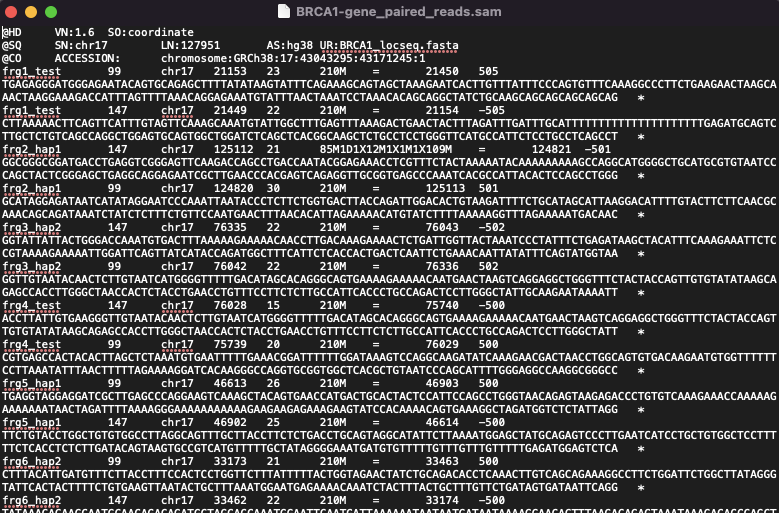 BRCA1-locus_paired_reads.fastq contains the same 6 reads as the above BRCA1-locus_paired_reads.fasta file, but with a quality line for each read