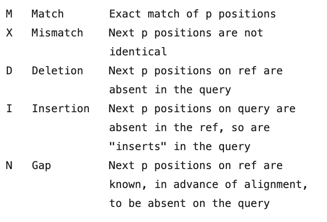 CIGAR strings have several operators, each preceded by a number, p the number of aligned nucleotides